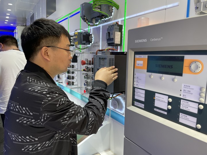 一輛集裝箱大卡車別出心裁地裝飾成移動的“會展中心”,印有西門子標(biāo)志的旗幟迎風(fēng)飄揚(yáng),車身“共創(chuàng)智能基礎(chǔ)設(shè)施新生態(tài)”幾個(gè)大字格外醒目。